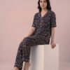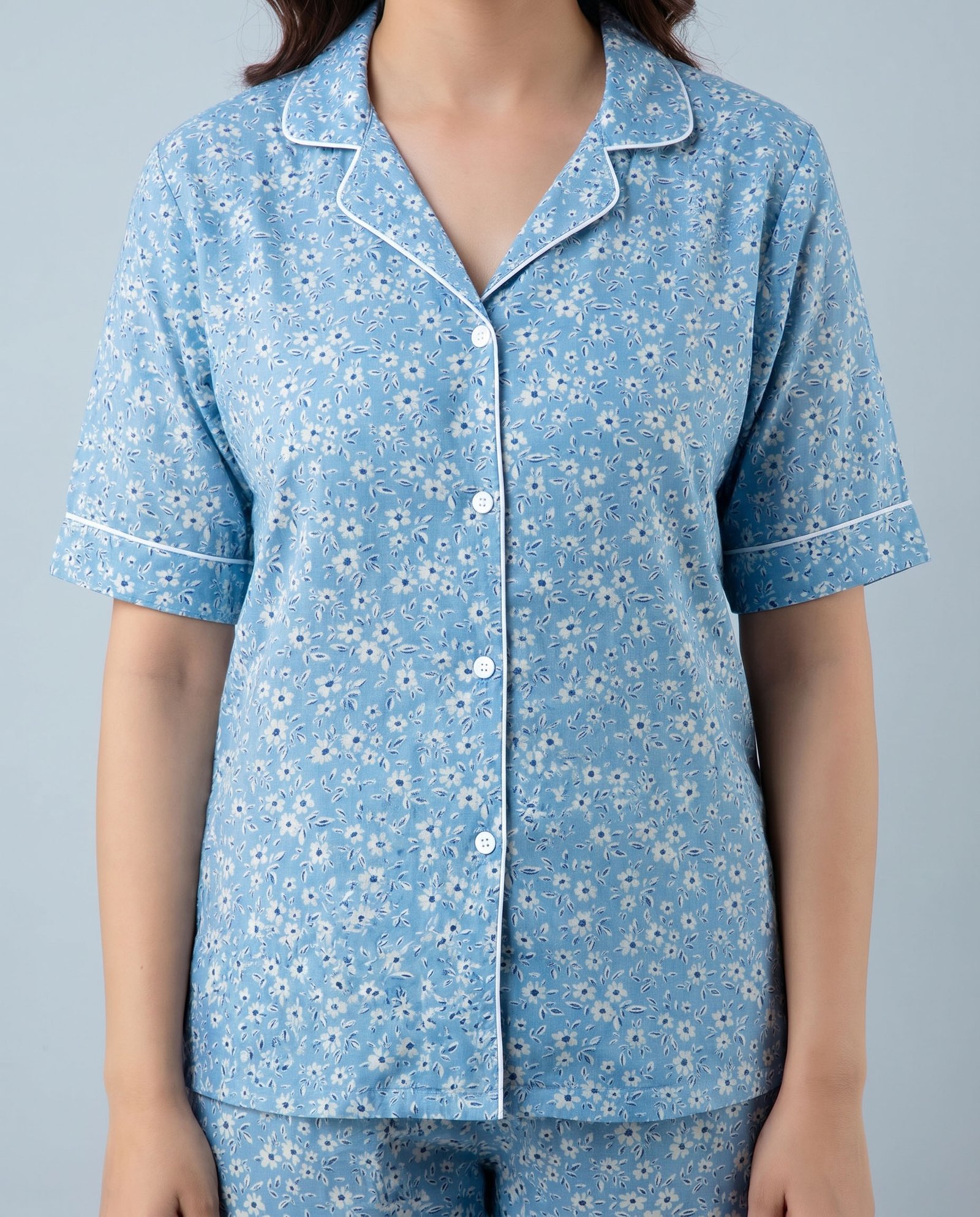 Women’s Blue Floral Daisy AOP Night Suit — Notch Collar Short Sleeve Top & Full-Length Pyjama Set