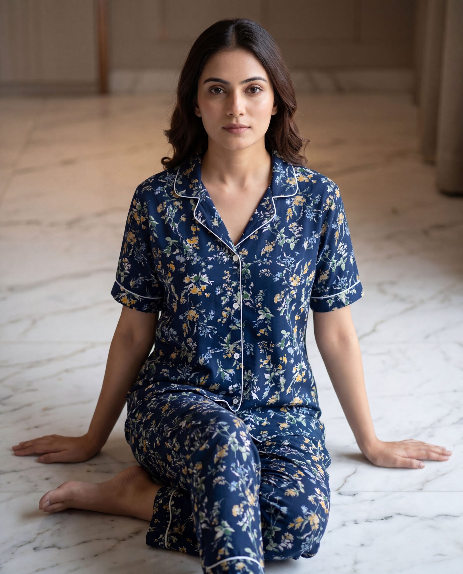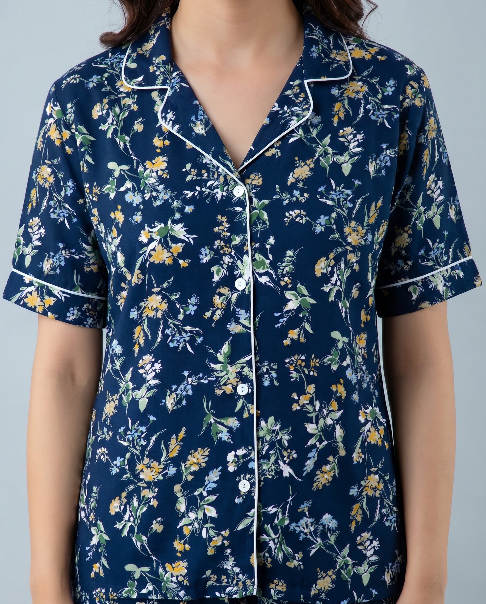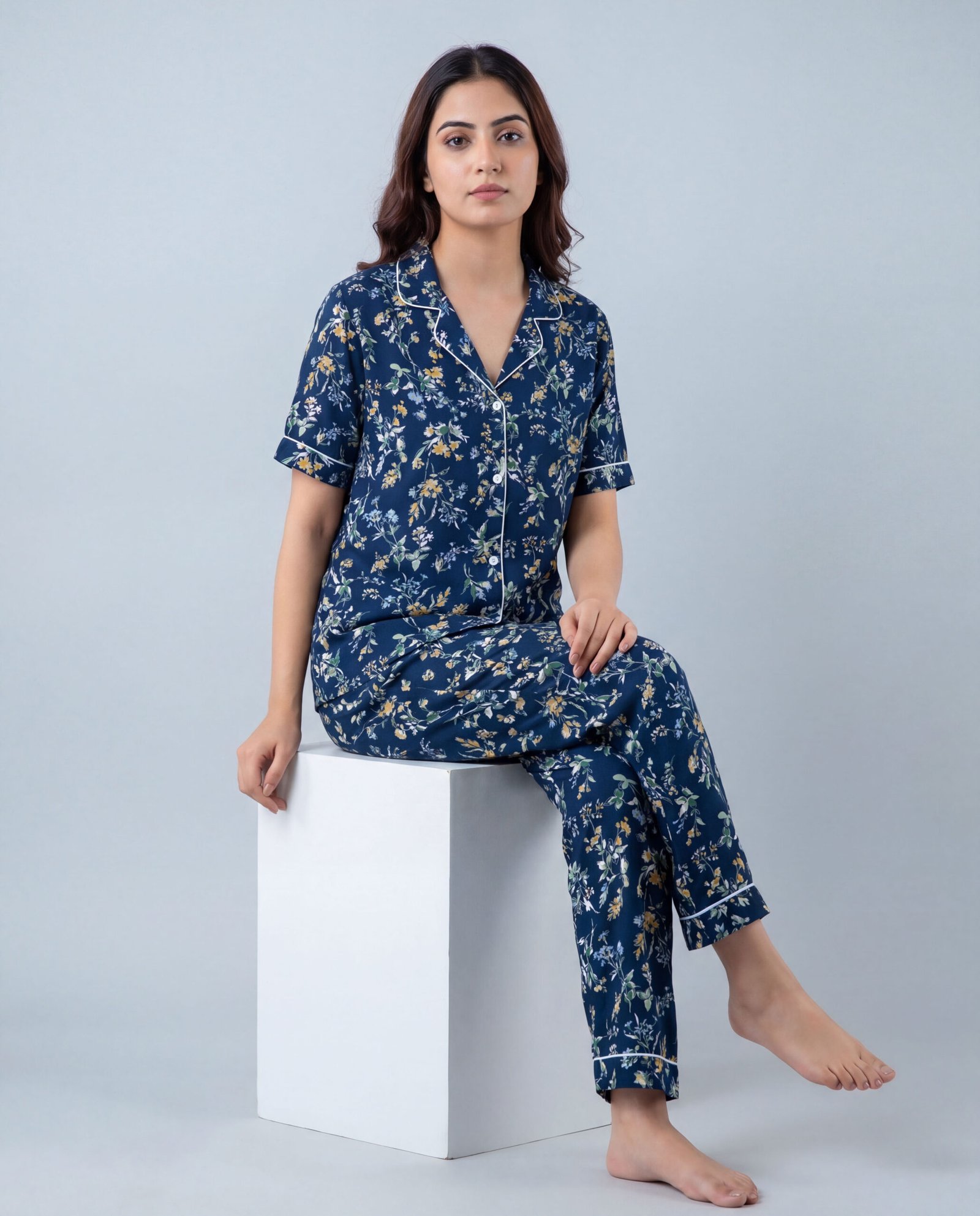 Women’s Navy Blue Floral AOP Night Suit Set | Short Sleeve Top & Full-Length Pyjama